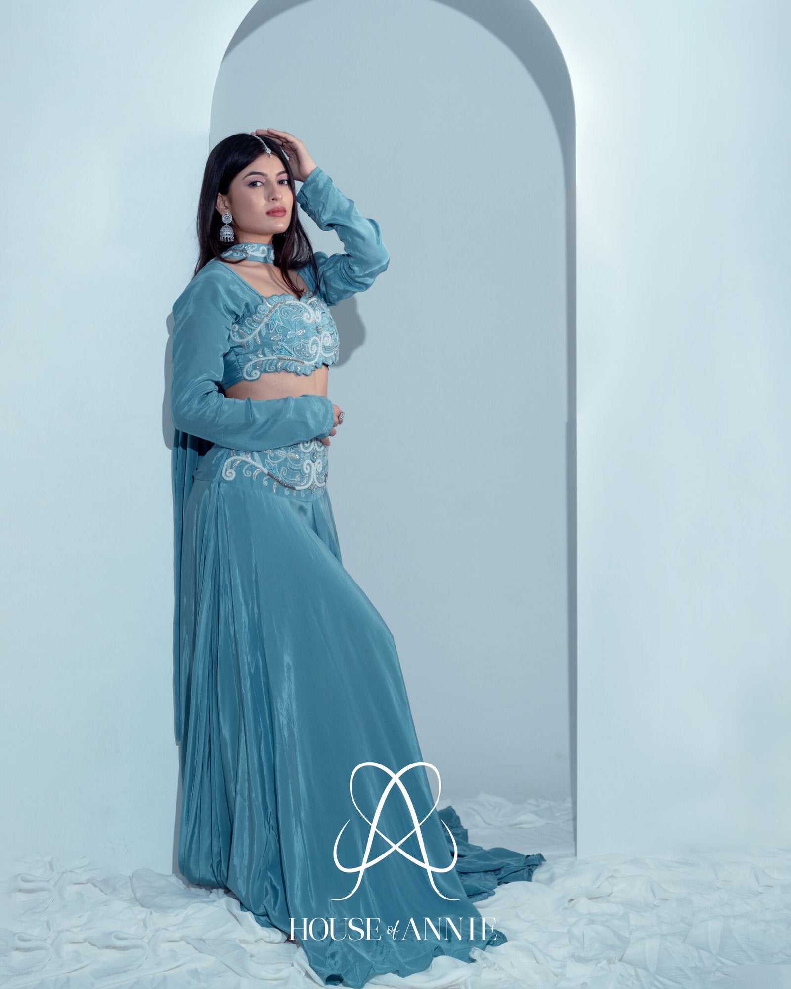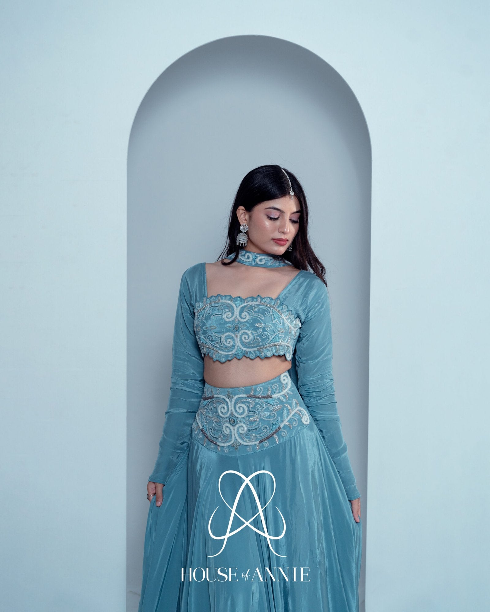 A crape lehenga embroidered on waist, paired with full sleeve blouse embroidered on bust and stole style dupatta around the neck.