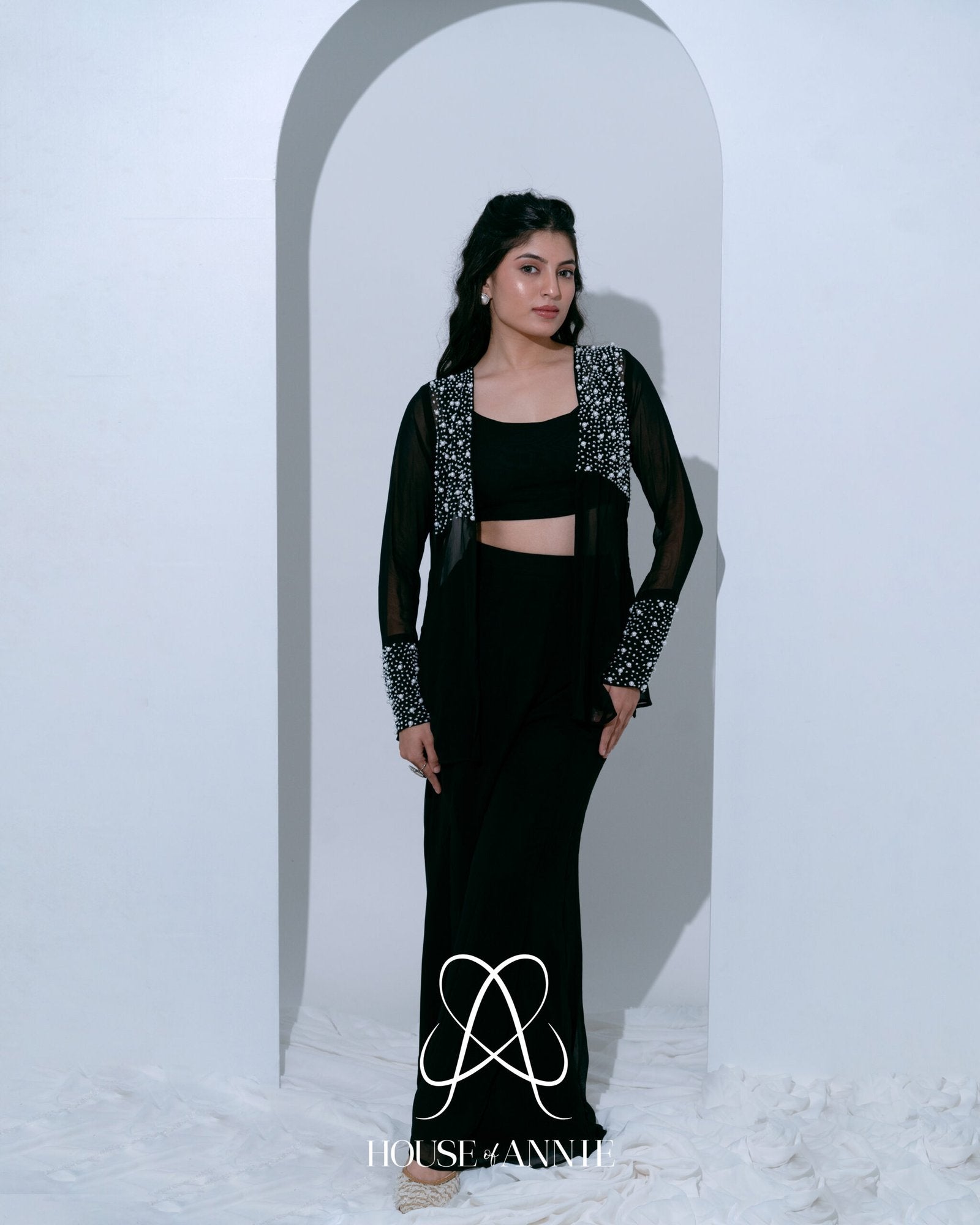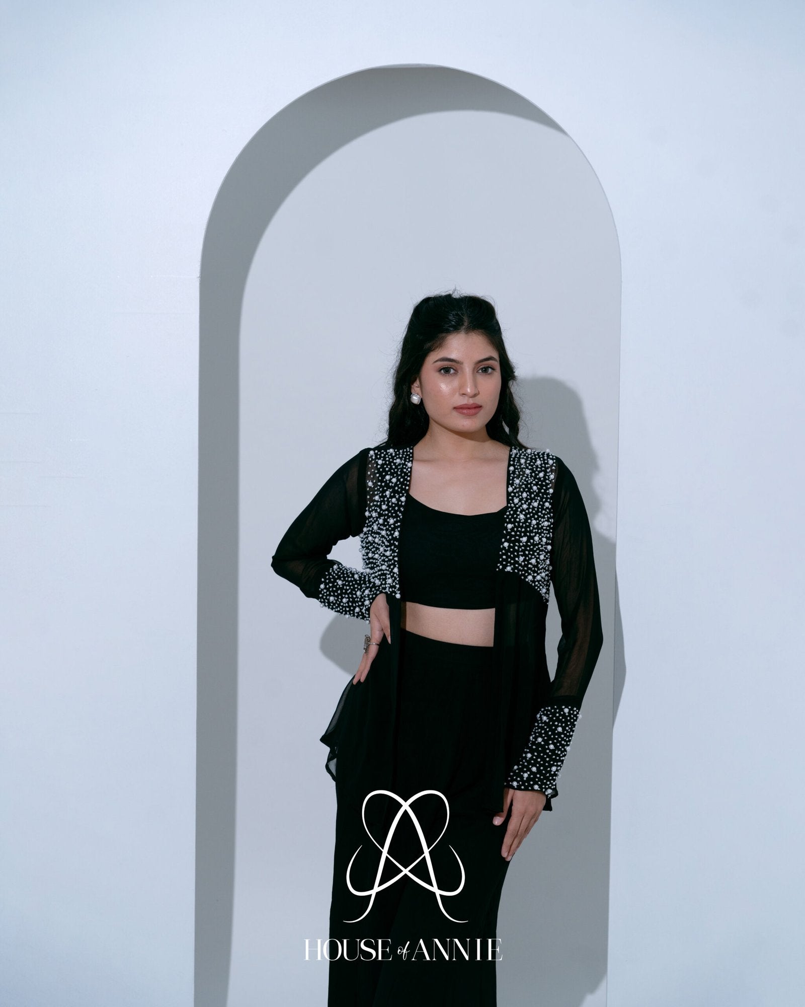 A full sleeves georgette jacket embroidered with pearls on shoulder and sleeves. Paired with bralette and flared pants.
