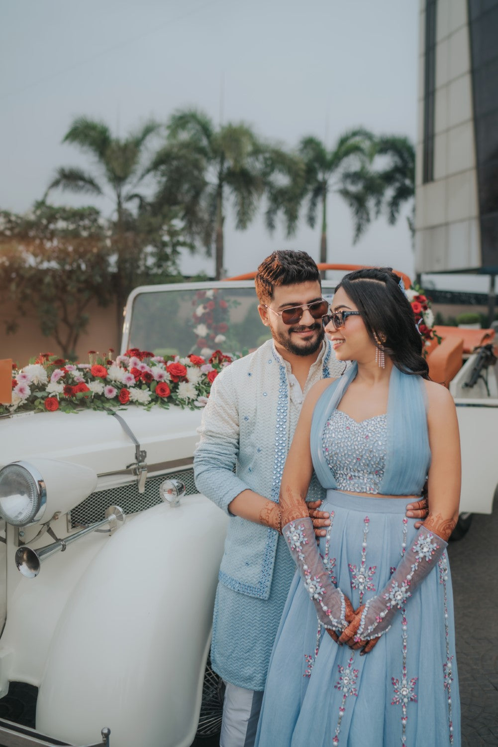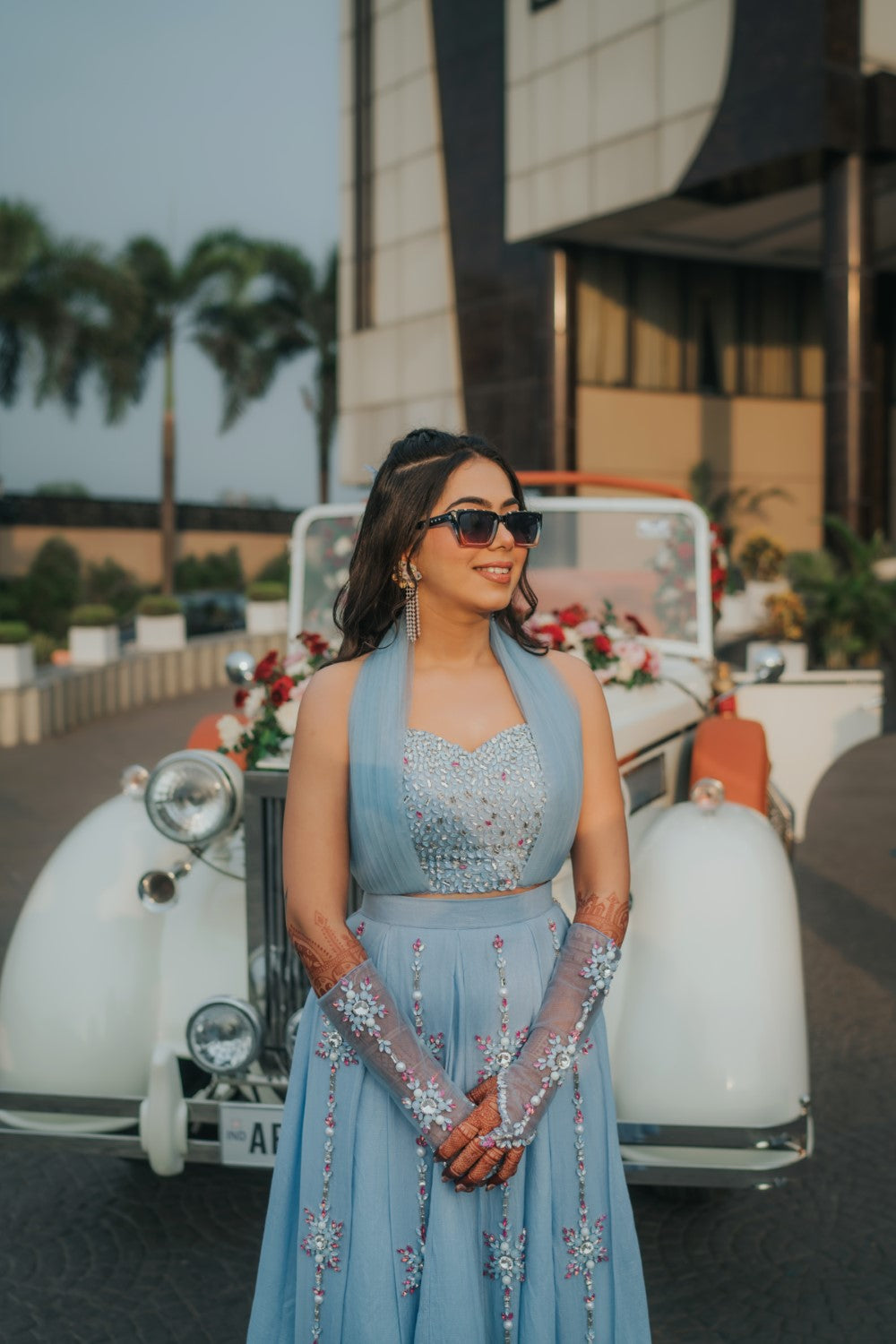 A radiant shine silk ankle-length box-pleated lehenga, exquisitely embellished with shimmering glass stones. Paired with a delicately pleated tulle halter neck top, this ensemble is perfectly completed with statement finger-ring gloves