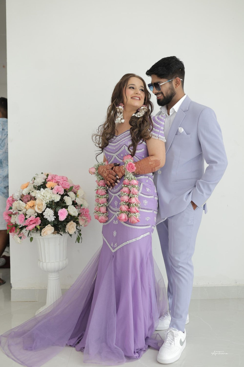A custom lilac georgette mermaid gown embroidered with seed beads, sequins, sadi and bugle beads. paired with our statement embroidered shoulder caps.