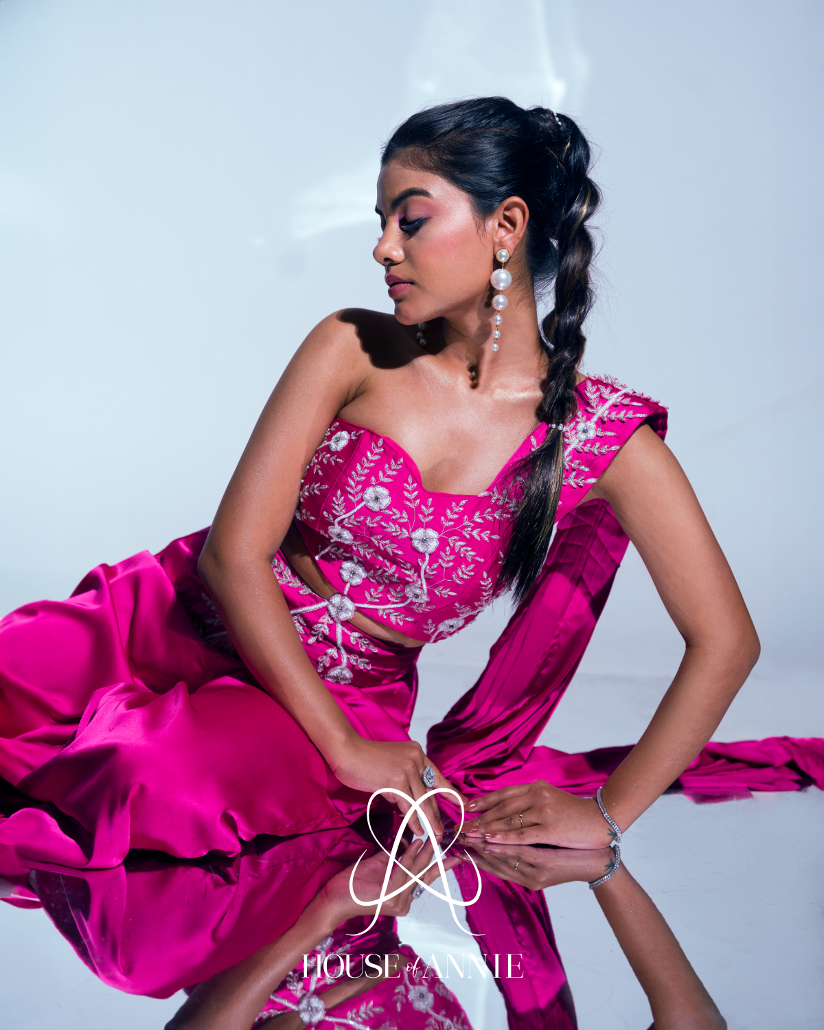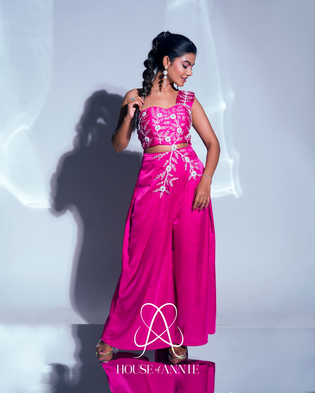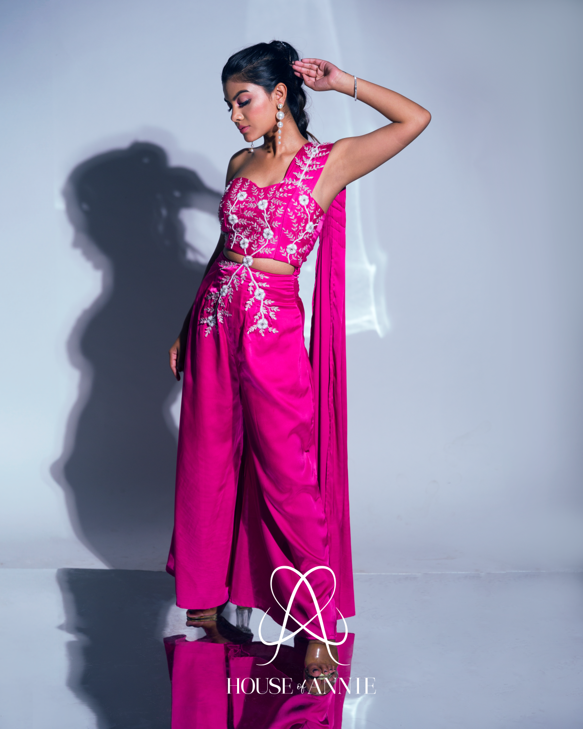 A signature pink one-shoulder jumpsuit with a waist cut embellished with floral motifs.
