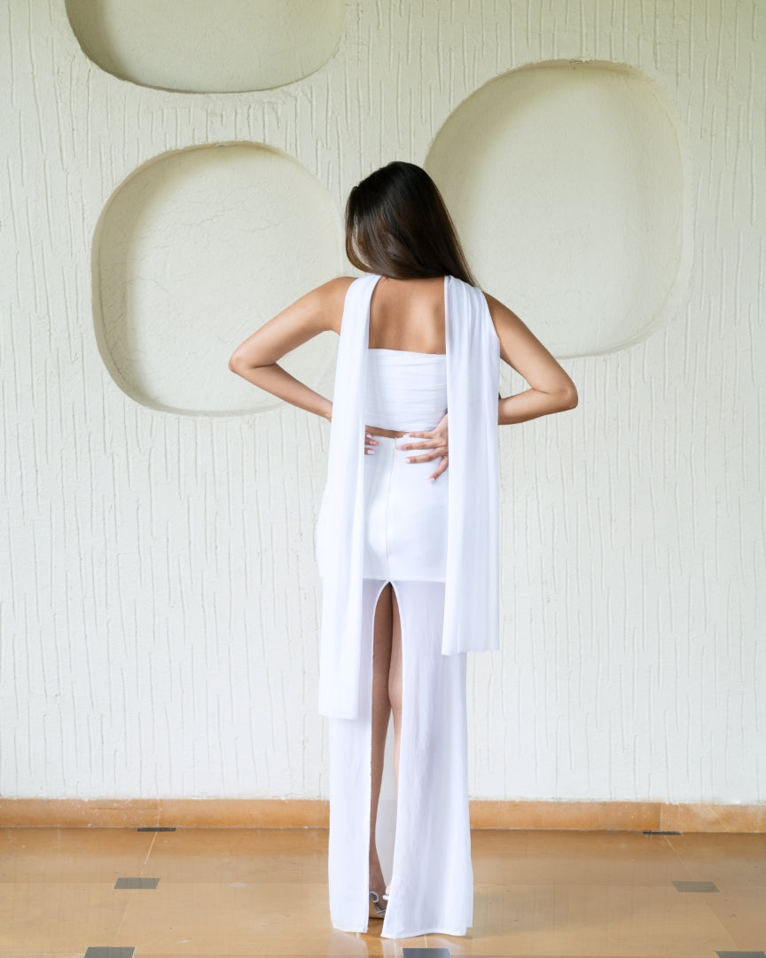 Two-piece co-ord set, designed for modern glamour. The strapless sweetheart neckline corset top features a sleek, structured fit with an attached flowing drape for added sophistication. Paired with a high-waisted maxi skirt, the look is elevated by chic ruching at the waist and a daring thigh-high slit, creating the perfect balance with a stole.