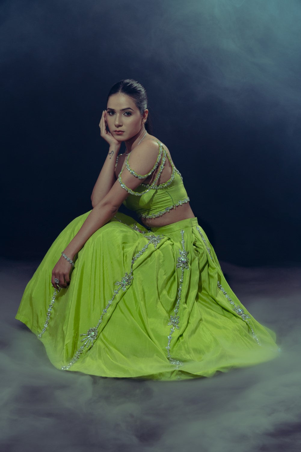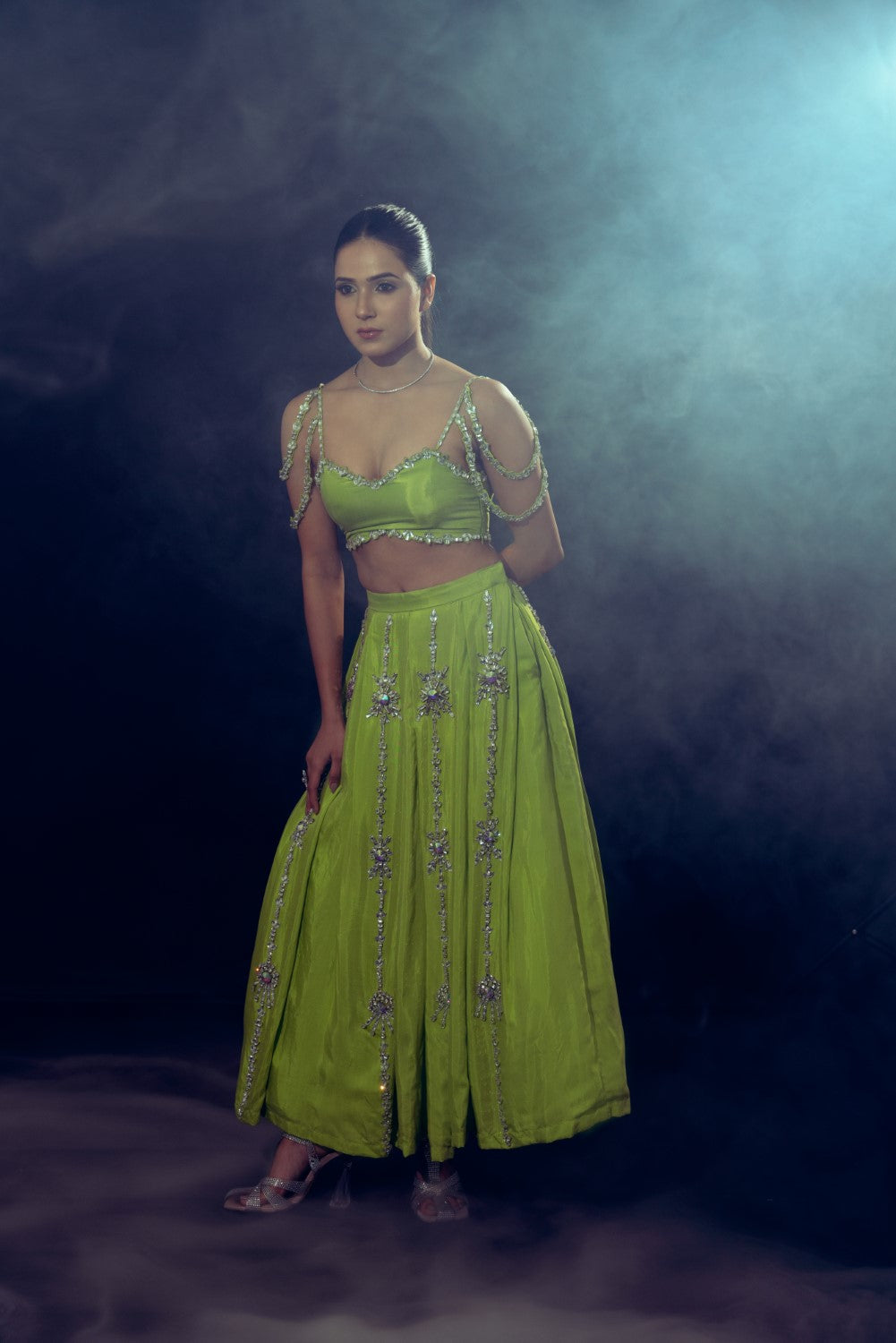 A captivating lime green muslin half lehenga, featuring elegant box pleats and shimmering glass stone embellishments. Paired with a layered bralette adorned with delicate glass stones, accentuated by tasteful cut-outs at the waist and necklinee