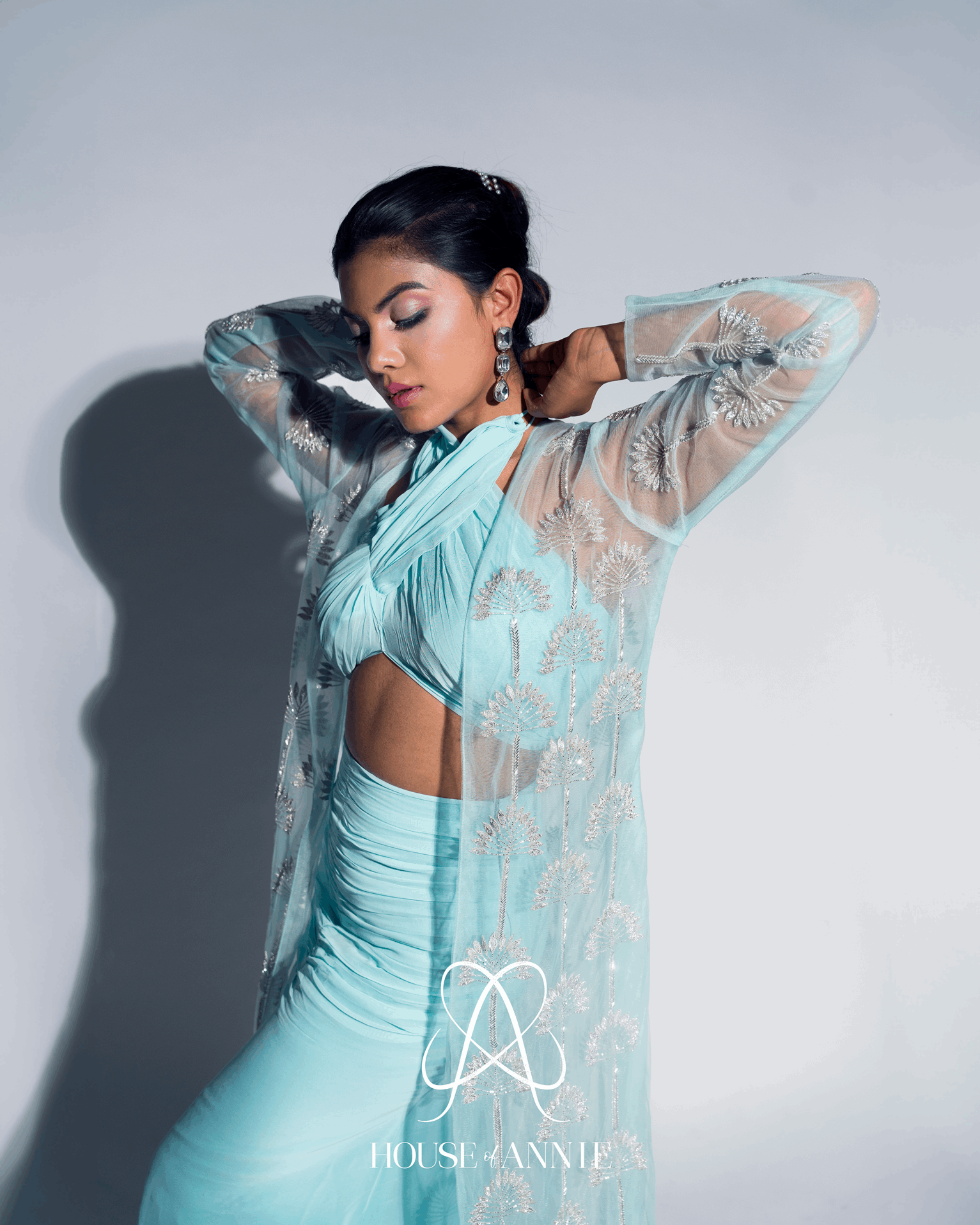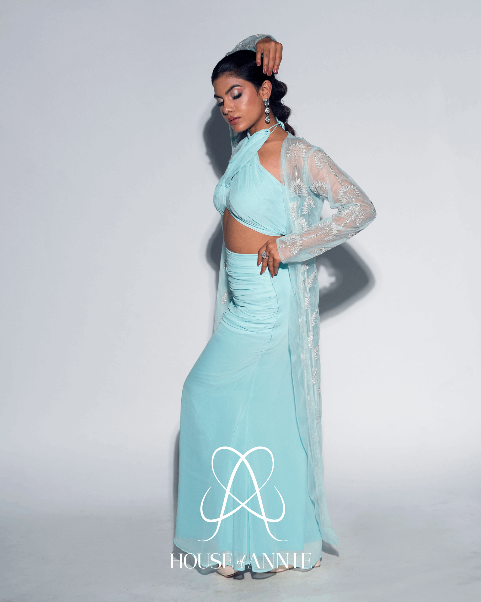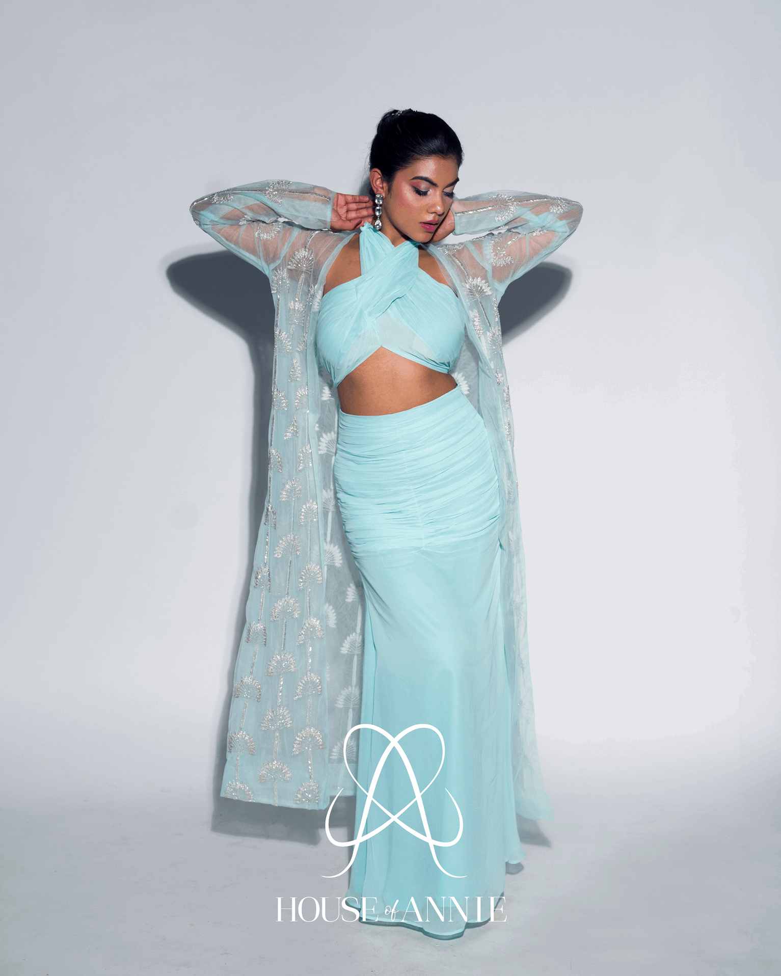 A georgette gathered straight skirt paired with a cross top and a tulle-embellished long jacket.