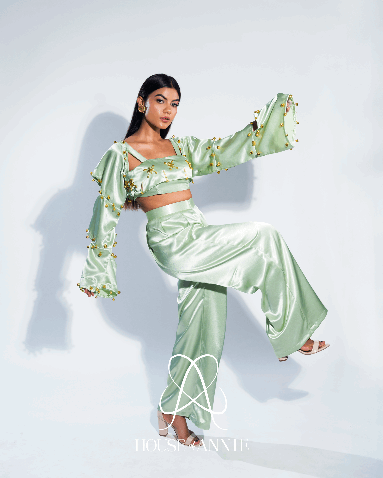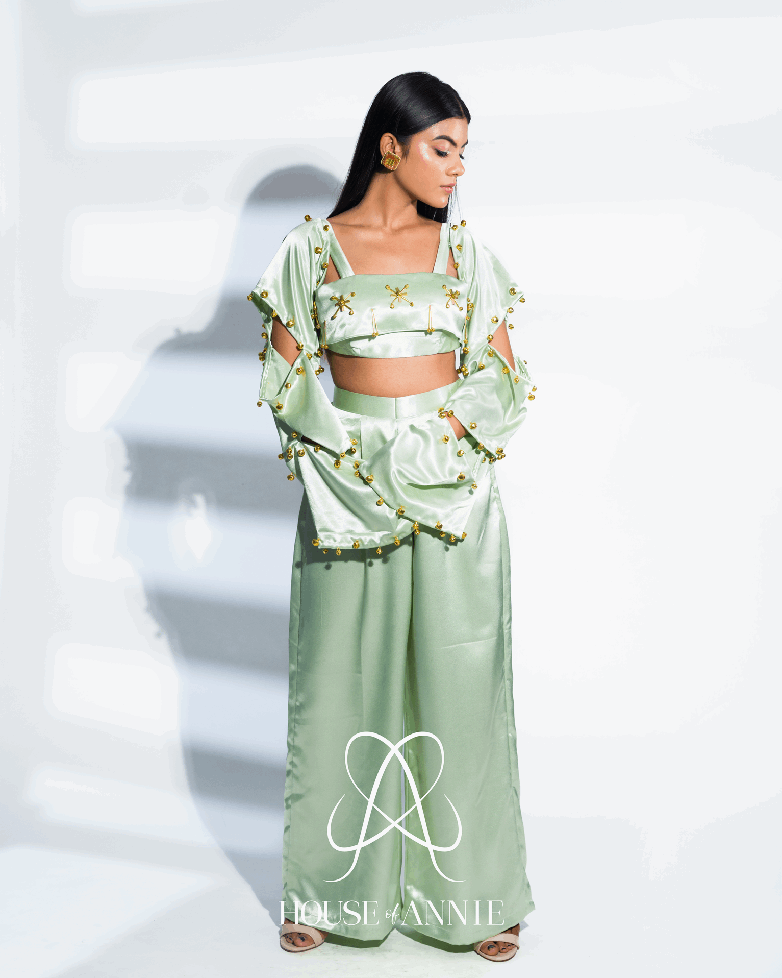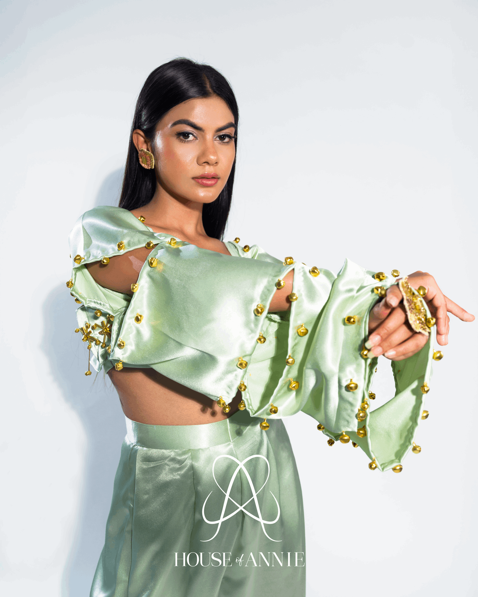 A top with hand embroidery and detached cut sleeves adorned with ghungroos, paired with straight pants.