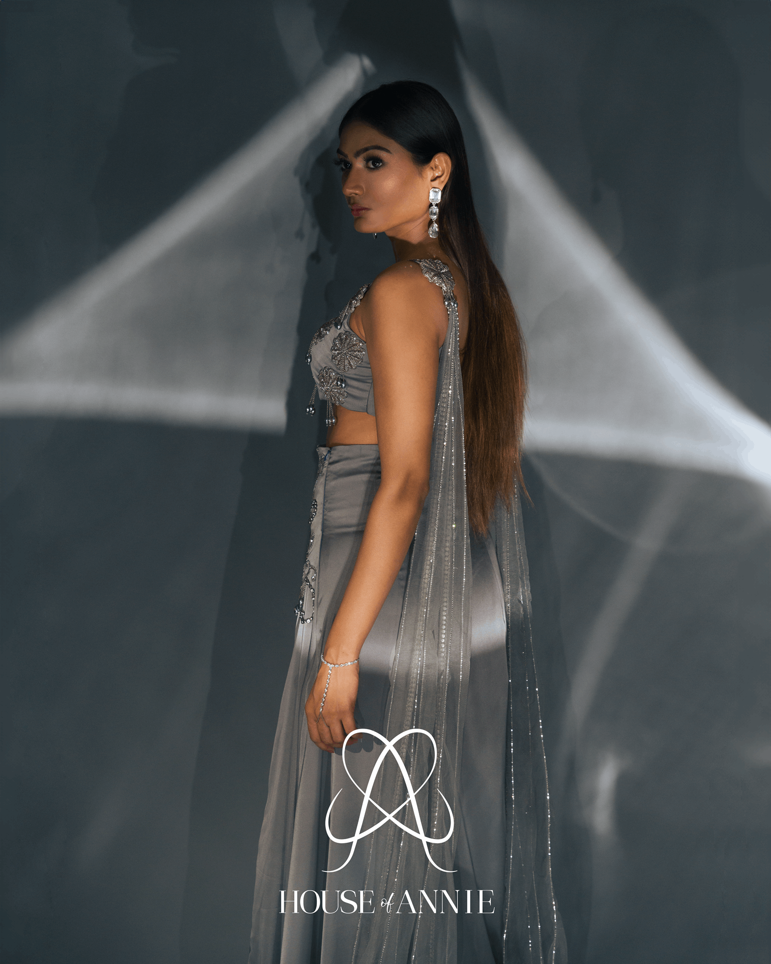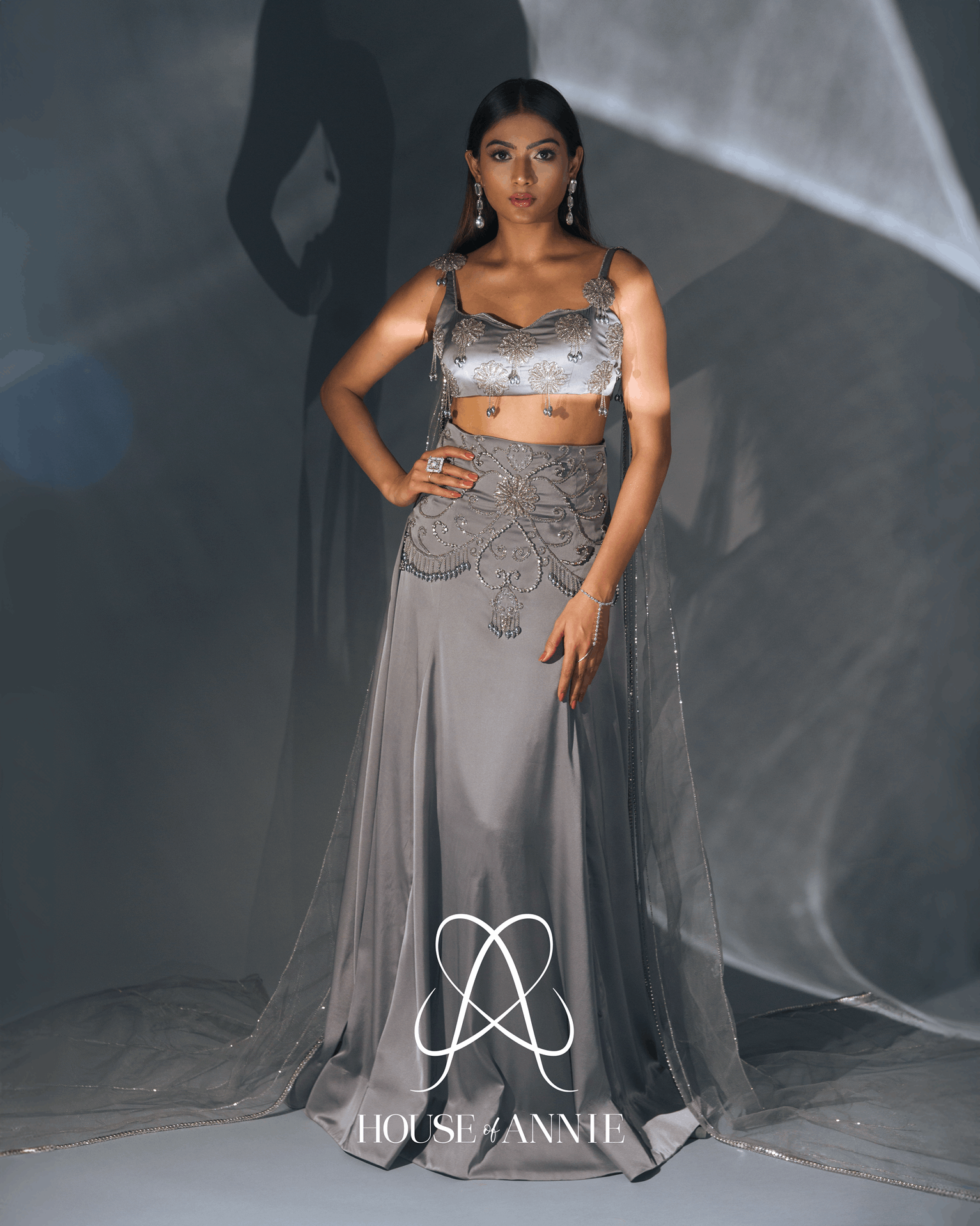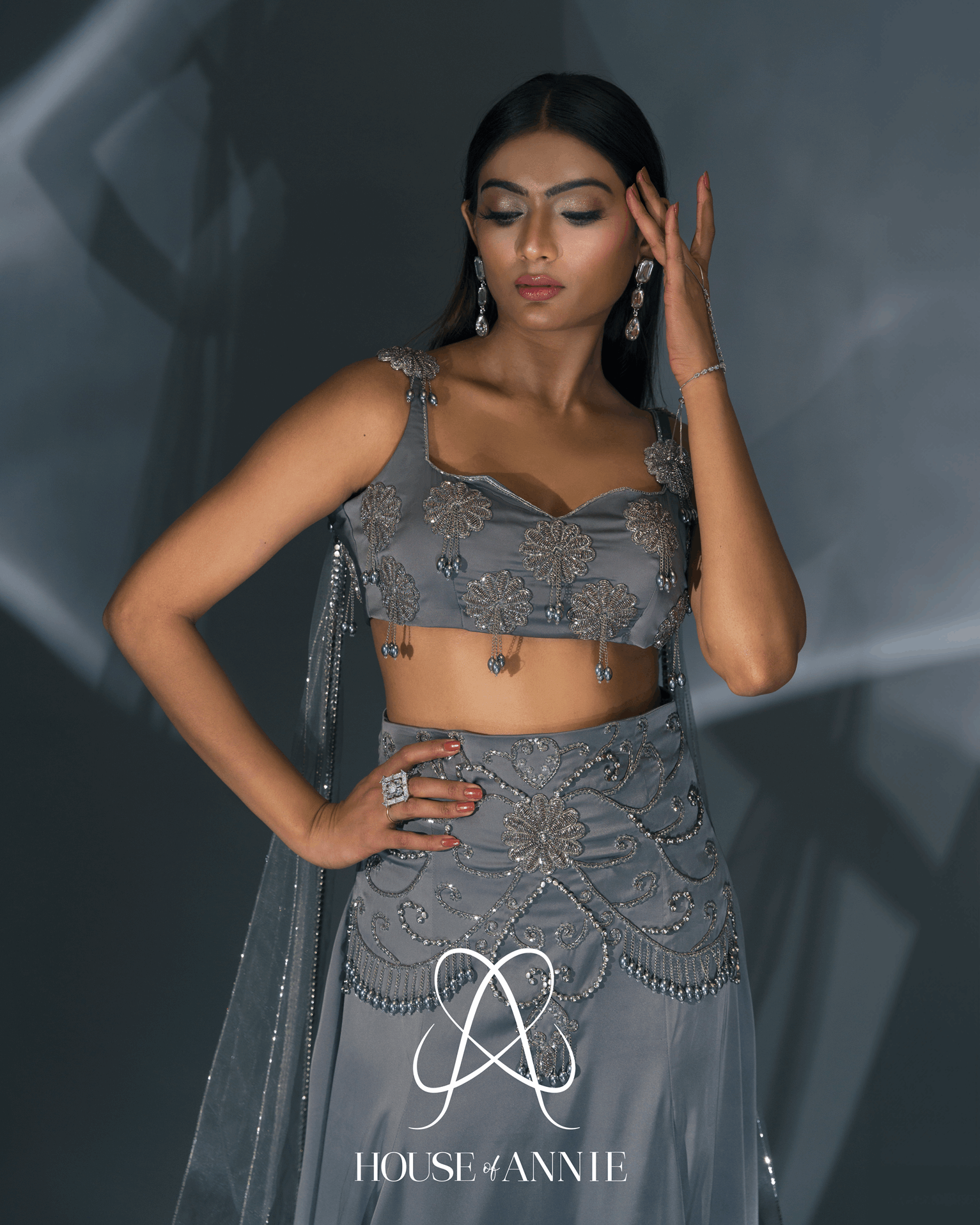 A grey blouse intricately adorned with 3D flowers, glass cut beads, metal chains, and metal drops. Paired with a high-waisted lehenga embellished all over with cut beads, metal beads, chains, and drops, accompanied by an asymmetrical dupatta.