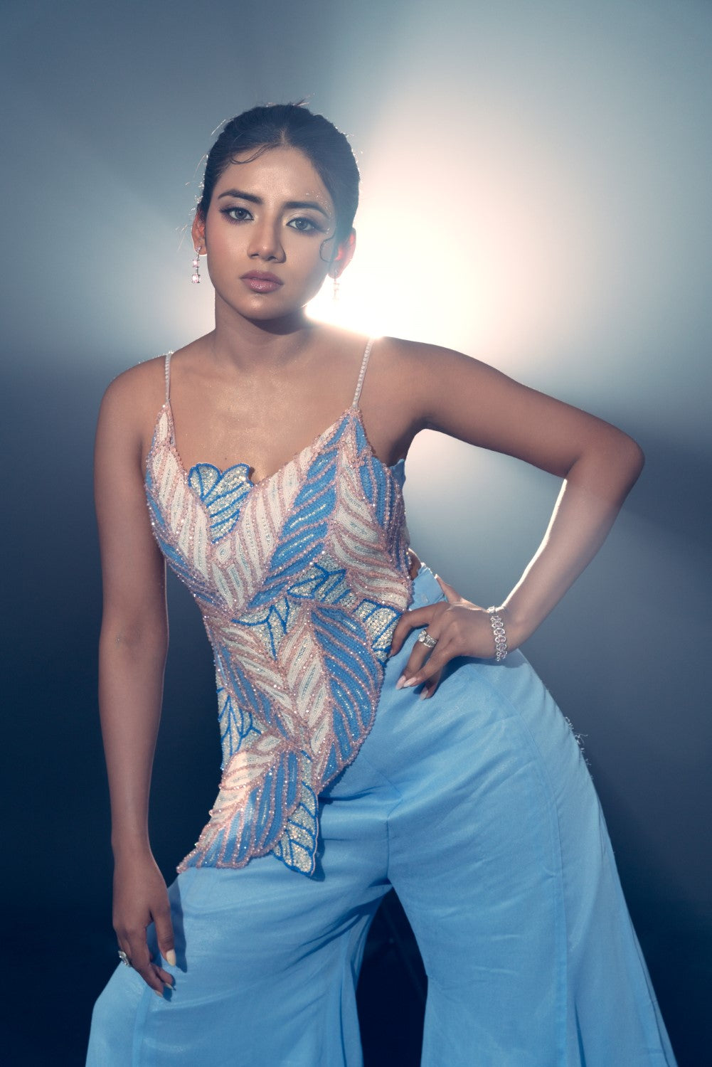 a beaded one shoulder top in powder blue, heavily embroidered 3d leafs, beads and crystal. paired with amatching georgette gharara