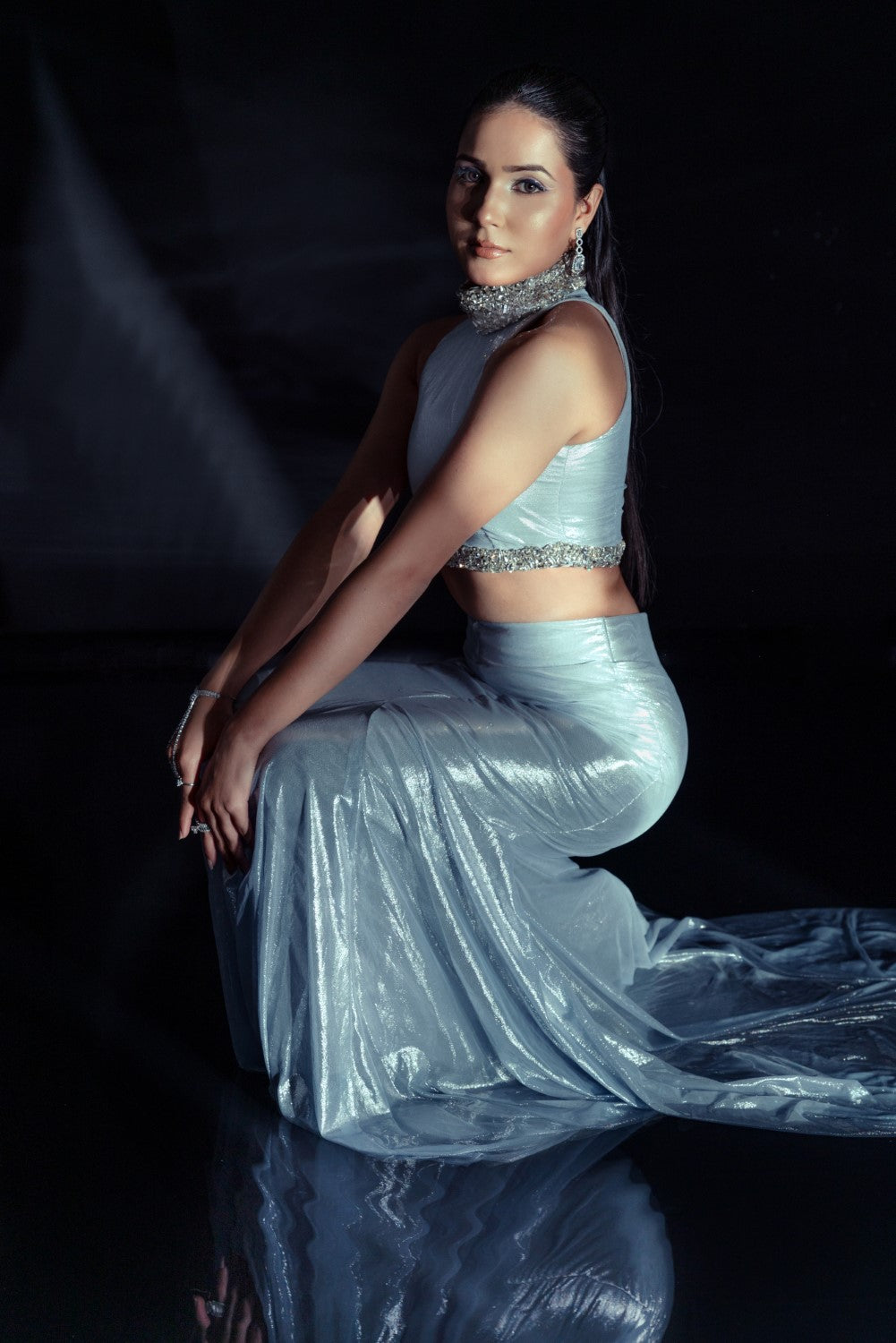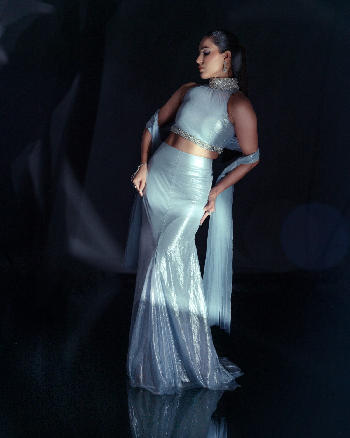 A stunning halter neck top adorned with intricate stone embroidery along the neckline and waist. Paired with a gracefully sculpted fish-cut skirt and a unique dupatta crafted from a blend of sheer net and shimmering fabric.
